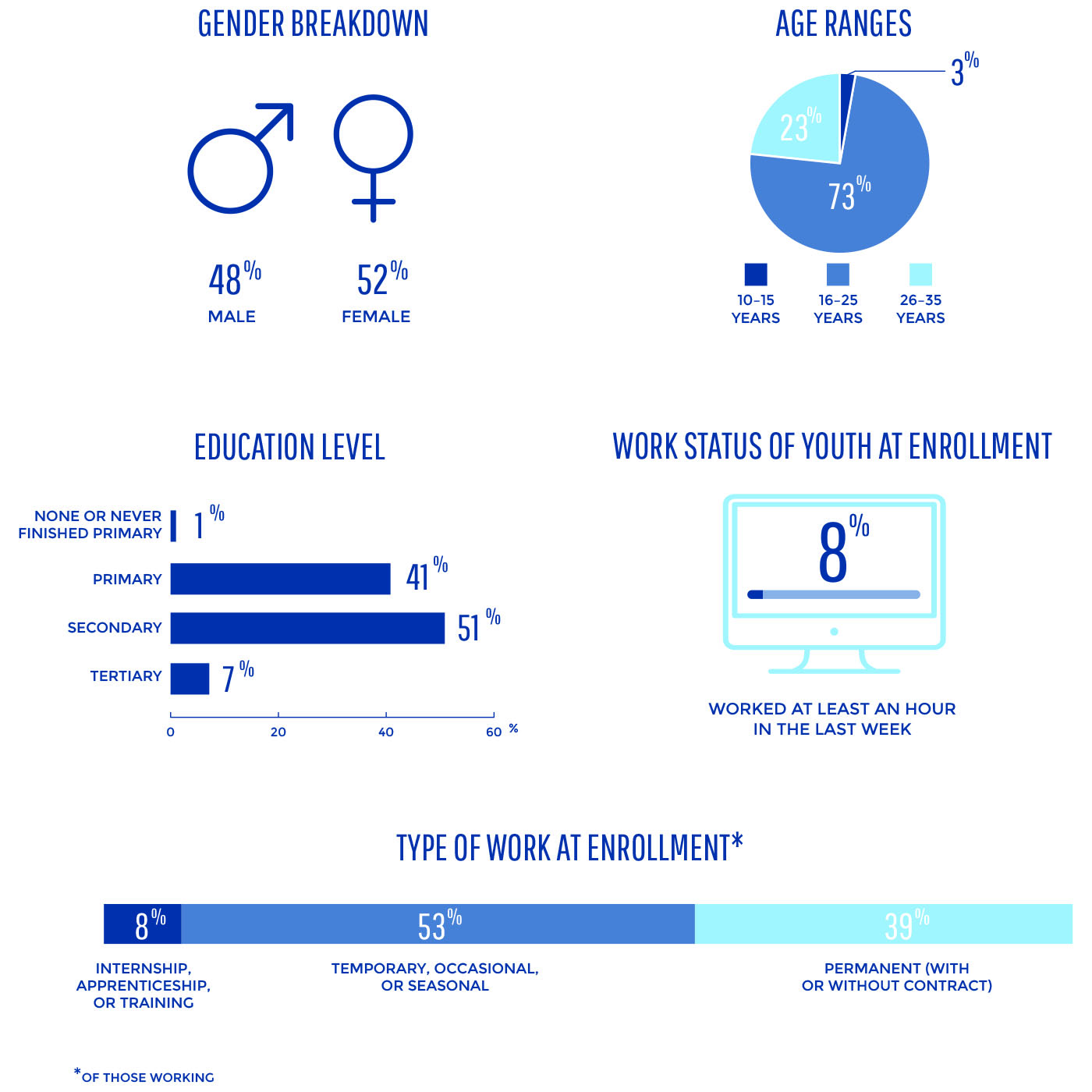 Since 1990, IYF has worked in over 100 countries, directly impacting 7.4 million young people and indirectly benefiting an additional 12 million. In 2017, with the help of global and local partners, those numbers continued to grow. As you’ll see below, the youth we serve come from diverse backgrounds and circumstances, but they all possess the potential to shape the future with passion and purpose.