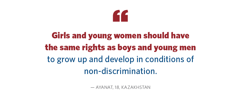 Too often, girls and young women are left out of conversations about the issues that matter the most in their lives. In fact, as Diana, an 18-year-old college student from Kazakhstan, points out, “In the near past, girls’ rights were not considered important.” Unfortunately, in many ways, they still aren't; however, as Diana also notes, there is room for hope. “Girls should be free to do what they want,” she says, “and today in our society, everything is possible.”
