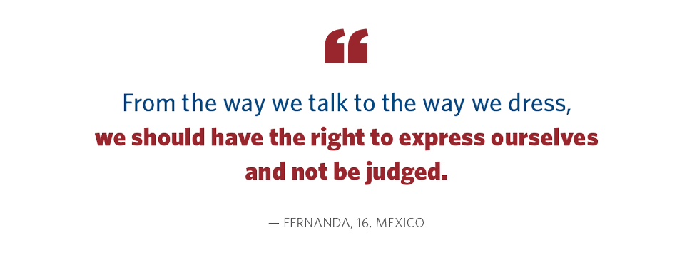 Even when girls and young women are theoretically accorded the same rights as their male counterparts, sexist stereotypes often fade slowly, and freedoms don’t always play out in practice. Recognizing this, Fernanda, a 16-year-old high school student from Mexico, explains that the way to “eradicate sexism” and to ensure that “families do not transfer [sexist views] from generation to generation,” is through education.