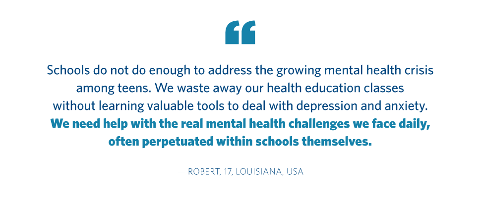 "Schools do not do enough to address the growing mental health crisis among teens," Robert from Louisiana says. "We waste away our health education classes without learning valuables tools to deal with depression and anxiety. We need help with the real mental health challenges we face daily, often perpetuated within schools themselves."