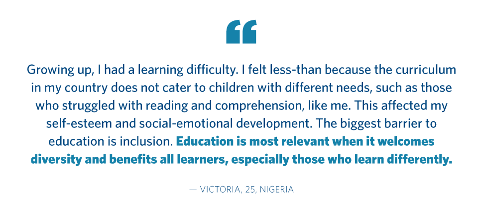 For Victoria, a 25-year-old YALI Mandela Washington Fellow from Nigeria working with IYF this August, this work means becoming more inclusive. "Growing up, I had a learning difficulty. I felt less-than because the curriculum in my country does not cater for children with different needs, such as those who struggled with reading and comprehension, like me. This affected my self-esteem and social-emotional development. The biggest barrier to education is inclusion. Education is most relevant when it welcomes diversity and benefits all learners, especially those who learn differently."