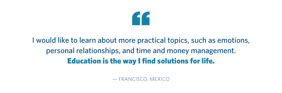 Karla, Mariana, and Francisco from Mexico echo the responses from Tanzania and Louisiana. Karla says she would like to learn how to control her emotions, know herself better, and feel more confident. "I would like to learn about more practical topics, such as emotions, personal relationships, and time and money management," says Francisco. "Education is the way I find solutions for life."