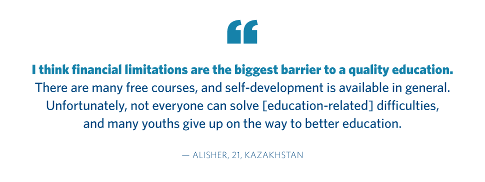 Although he lives across the world in Kazakhstan, 21-year-old Alisher also said money is an issue for young people. "I think financial limitations are the biggest barrier to a quality education," said the Atyrau State University graduate and participant in Zangar science, technology, engineering, and math (STEM) courses. The Zangar initiative, led in partnership with Chevron, reaches young people with hands-on STEM learning, life skills, and community engagement opportunities. "There are many free courses, and self-development is available in general. Unfortunately, not everyone can solve [education-related] difficulties and many youths give up on the way to better education."