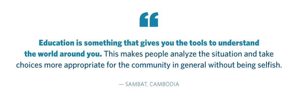 "Education is something that give you the tools to understand the world around you. This makes people analyze the situation and take choices more appropriate for the community in general without being selfish," says Sambat, a 2012 YouthActionNet® Fellow who founded Self Help Community Centre, an organization providing free education to children and youth in Cambodia.