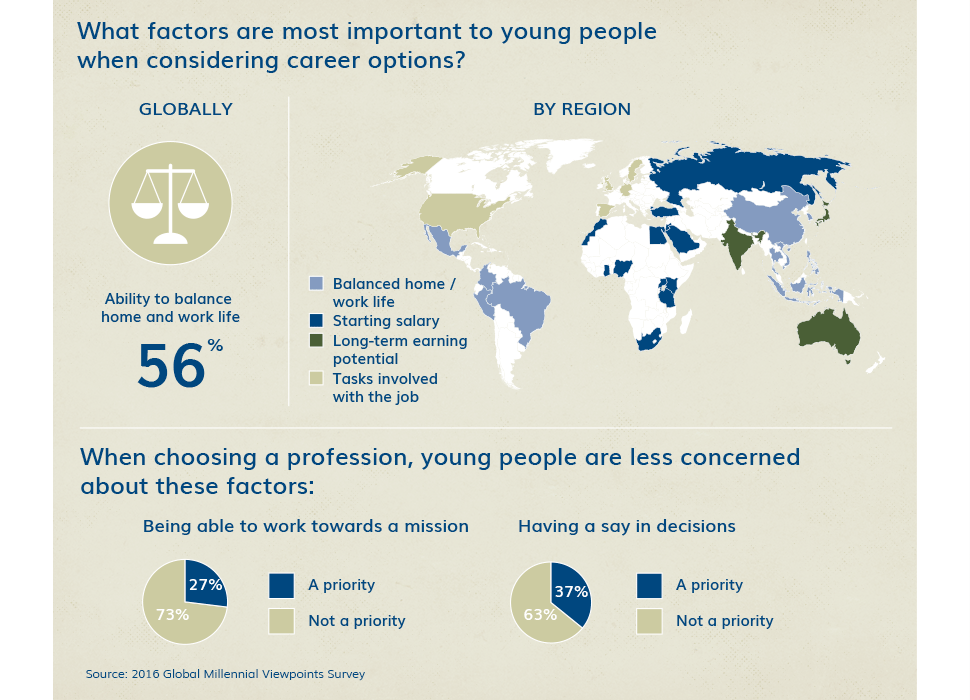 Globally, almost 118 million young people will turn 18 in the next year. Using current projections for just one region, Sub-Saharan Africa, 11 million youth are entering the labor market there every year. As countries in every part of the world struggle with skills mismatches, and many simply cannot offer enough jobs to keep pace with the expanding youth population, what do young people think about the world of work and the careers that are in front of them?