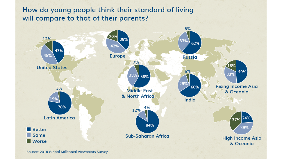 Despite challenges, the vast majority of youth recently polled by IYF feel that their standard of living will be better than their parents. This optimism is strongest in Sub-Saharan Africa and Latin America, where clear advances have been made in the past four decades. How can the world—including businesses and governments—harness this positive outlook for our collective good?