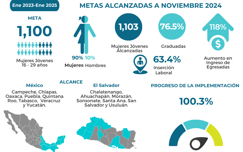 En México, la iniciativa destacó por fortalecer tanto las competencias técnicas como las habilidades socioemocionales mediante el uso del currículo Passport to Success®. Además, el programa ofreció talleres de transición al mercado laboral, servicios de apoyo integral y estrategias de participación, impactando a 773 jóvenes. El enfoque estuvo en crear redes de apoyo sostenibles, oportunidades de mentoría, sistemas de referencia, estrategias laborales y un currículo especializado en orientación profesional para impulsar el desarrollo de las mujeres jóvenes en el sector TIC.