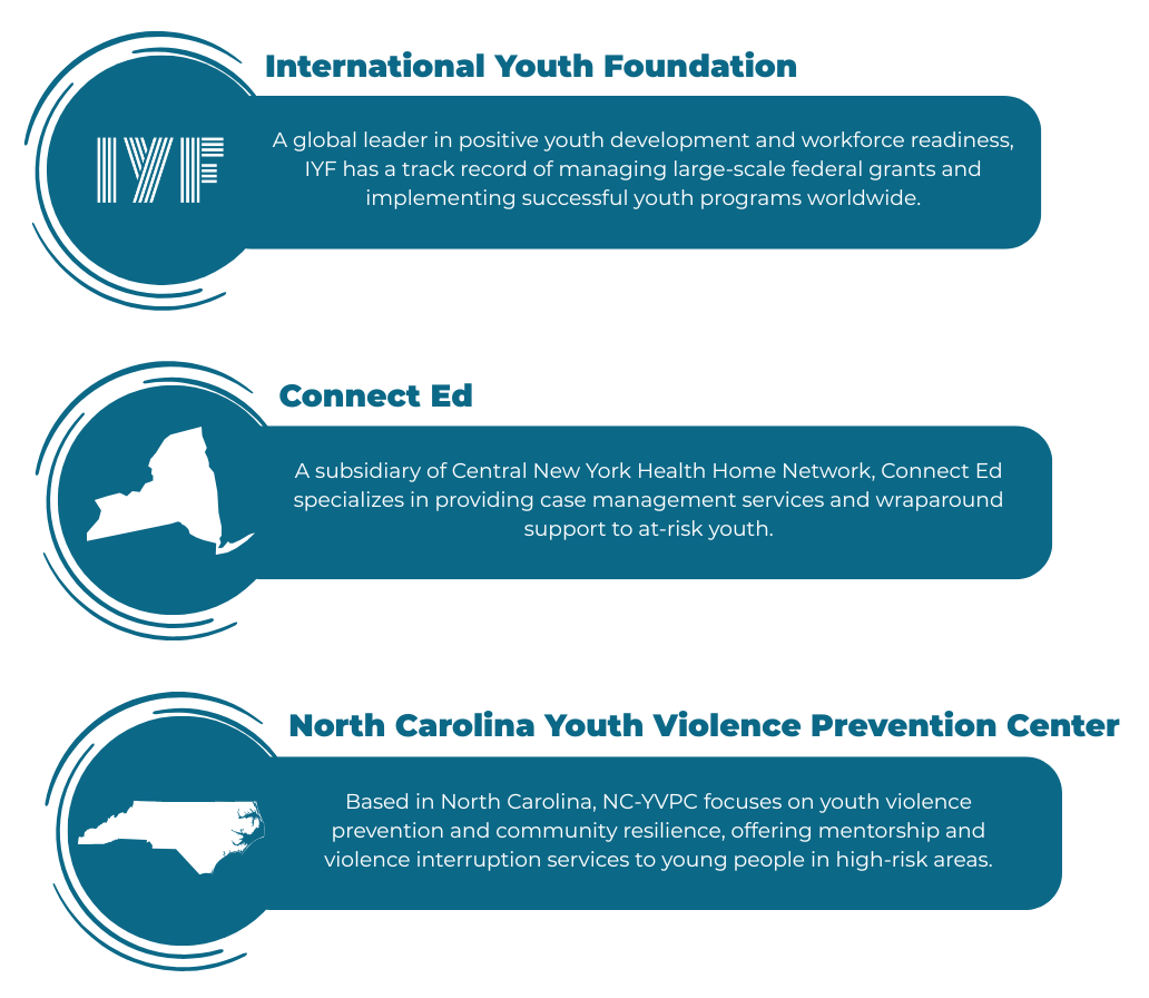 The success of the GO Program relies heavily on the collaboration between IYF, Connect Ed, and NC-YVPC. These partners bring a wealth of experience in youth violence prevention, mentorship, and workforce development, ensuring that participants receive the best possible support.