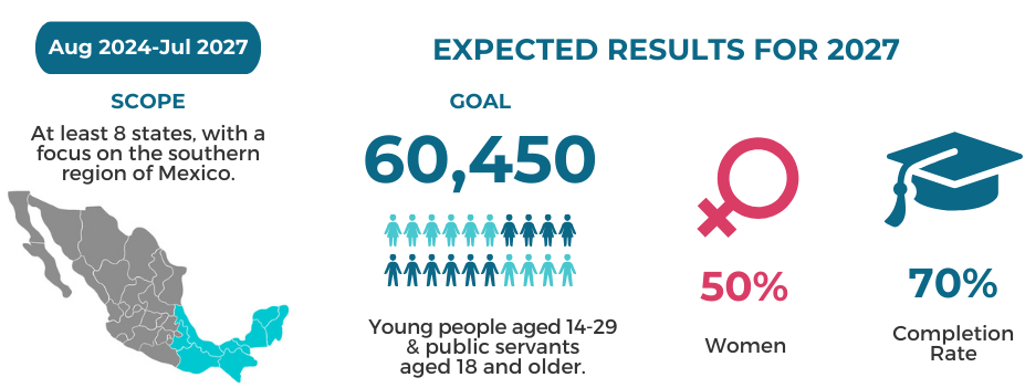The InteligencIA Program is implemented by the International Youth Foundation (IYF) with the support of Google.org, aims to empower marginalized youth and public servants in Mexico through enhanced digital skills, particularly in artificial intelligence (AI). Targeting 60,000 end beneficiaries, the program prioritizes inclusivity by seeking 50% female participation, aspiring to increase this to 60%. It focuses on youth aged 14-29 and public servants aged 18 and older, all from low-income backgrounds. This initiative spans at least eight states, particularly in the Southern region of Mexico.