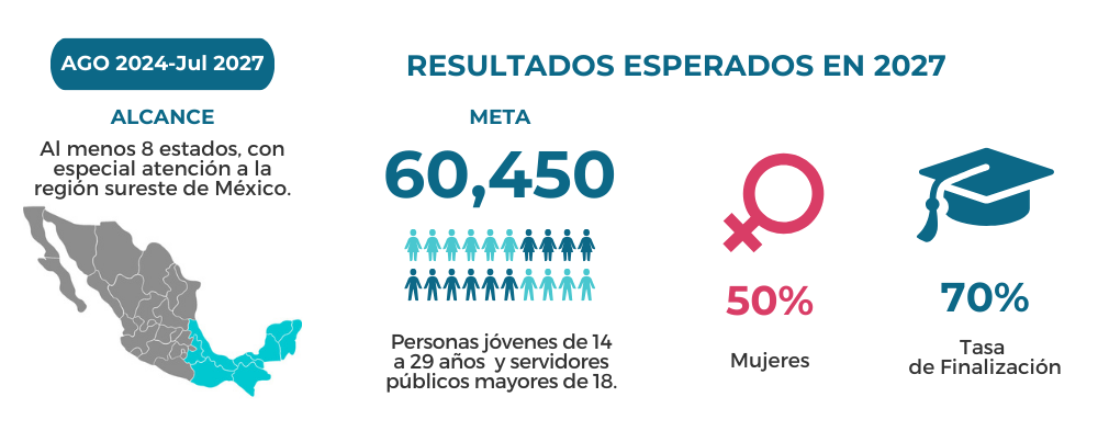 El programa se llevará a cabo mediante una serie de actividades diseñadas para cumplir metas concretas. En la primera fase, se realizará un mapeo de aliados y se implementará una cohorte piloto del curso AI Essentials, con una meta de inscripción de 8,000 personas y una proyección de finalización del 70% (con la aspiración de llegar al 80%). Se aplicarán encuestas para evaluar la confianza de las personas participantes en el uso de IA, con la expectativa de que el 80% de las juventudes y el 75% de las personas servidoras públicas perciban la formación como útil para sus necesidades.