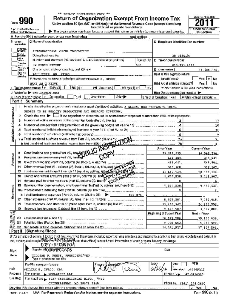 This completed IRS Form 990, or Return of Organization Exempt from Income Tax, was filed by the International Youth Foundation for 2011.