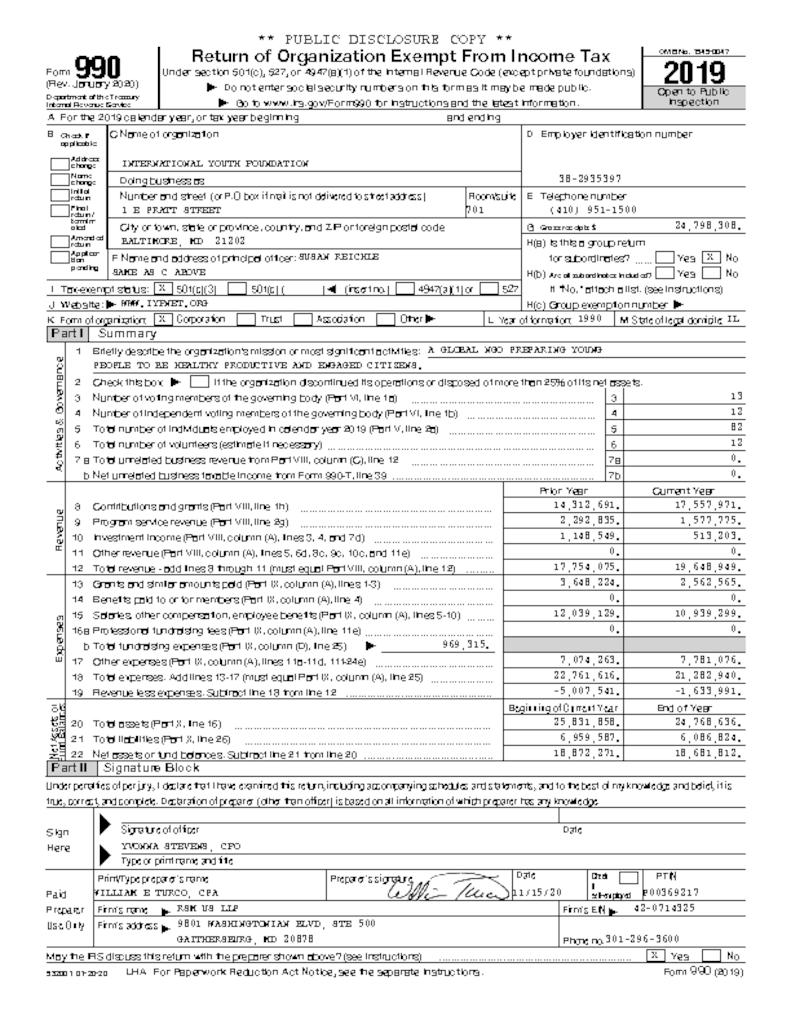 This completed IRS Form 990, or Return of Organization Exempt from Income Tax, was filed by the International Youth Foundation for 2019.