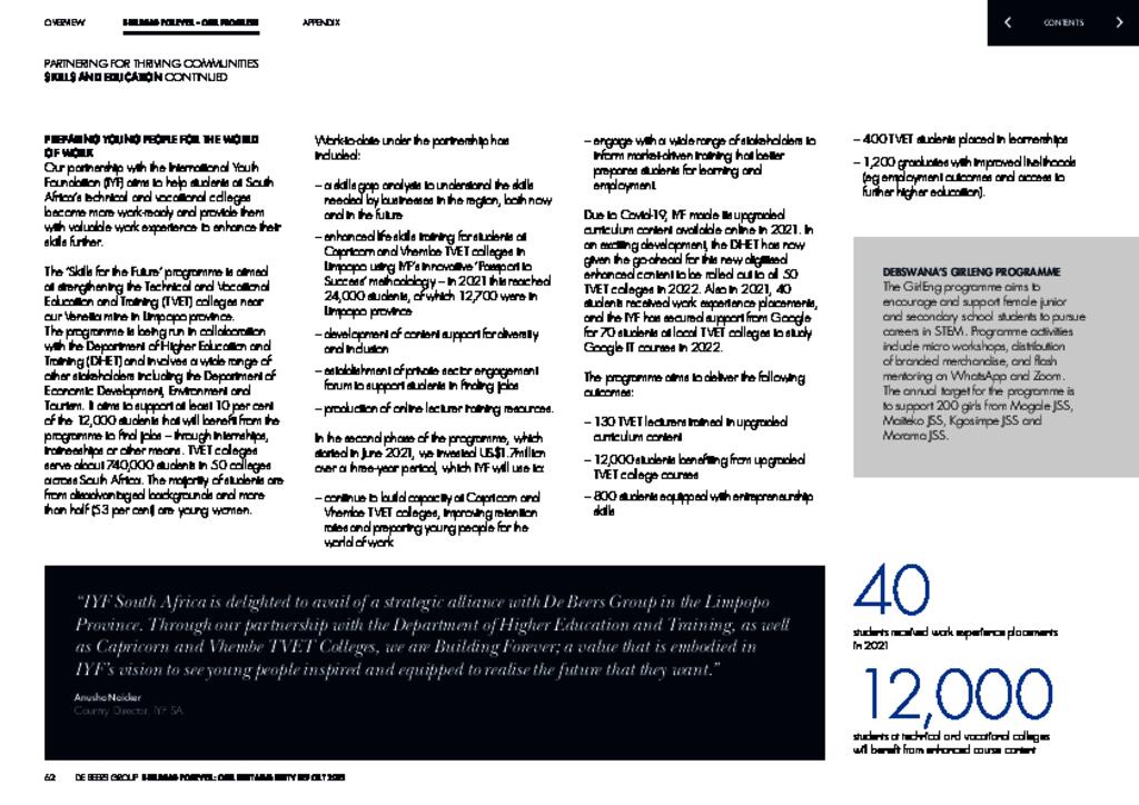Our partner De Beers Group recently published their 2021 Building Forever Sustainability Report, excerpted here. Learn more about the partnership, and how together we're making an impact in the lives of young South Africans.