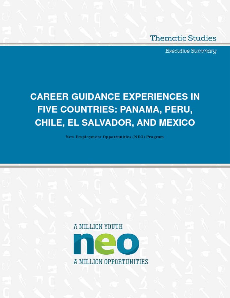 This document corresponds to the final report of the study entitled “Career Guidance Experiences in Five Countries: Panama, Peru, Chile, El Salvador, and Mexico”, which focuses on the NEO initiatives in Panama, Peru, Chile, El Salvador, and Mexico. The study was led by Fundación Chile under the coordination of Víctor Illanes and Gabriel Rojas. This study attempted to contribute to the complex web of pathways that must be opened up and explored to improve youth job placement in Latin America. In this area, the NEO initiative provides an opportunity to collect valuable information on how these pathways are being implemented, and on other new pathways to improve youth job placement.
