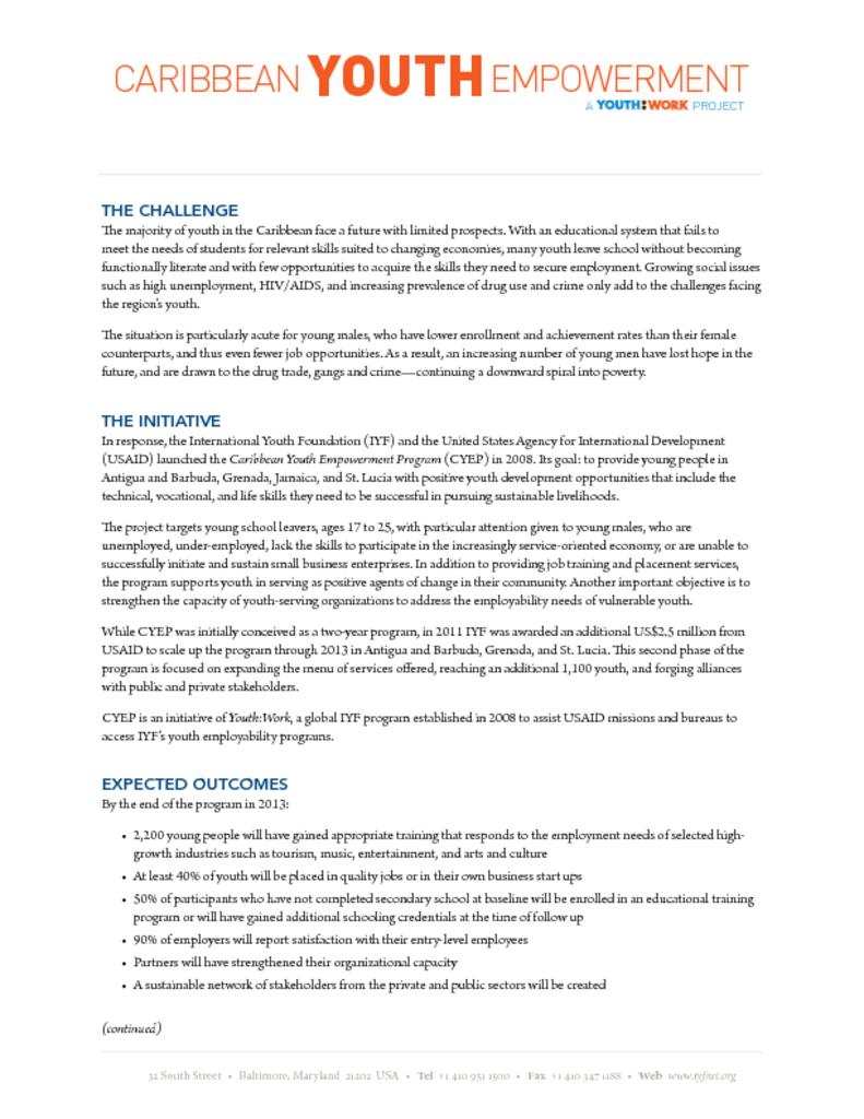 This fact sheet provides a brief description of the Caribbean Youth Empowerment Program (CYEP) in Antigua and Barbuda, Grenada, Jamaica, and St. Lucia. Launched in 2008 and concluded in 2013, CYEP equipped youth with the technical, vocational, entrepreneurship, and life skills needed to develop sustainable livelihoods.