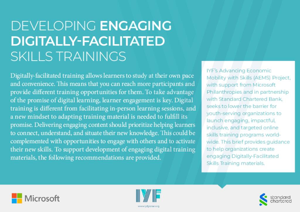 IYF’s Advancing Economic Mobility with Skills (AEMS) Project, with support from Microsoft Philanthropies in partnership with Standard Chartered Bank, seeks to lower the barrier for youth-serving organizations to launch engaging, impactful, inclusive and targeted online skills training programs world-wide. This brief provides guidance to help organizations create Engaging, Impactful Digitally-Facilitated Skills Training materials.