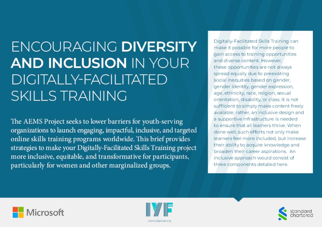 The Advancing Economic Mobility with Skills (AEMS) Project seeks to lower barriers for youth-serving organizations to launch engaging, impactful, inclusive and targeted online skills training programs world-wide. This brief provides strategies to make your Digitally-Facilitated Skills Training project more inclusive, equitable, and transformative for participants, particularly for women and other marginalized groups.