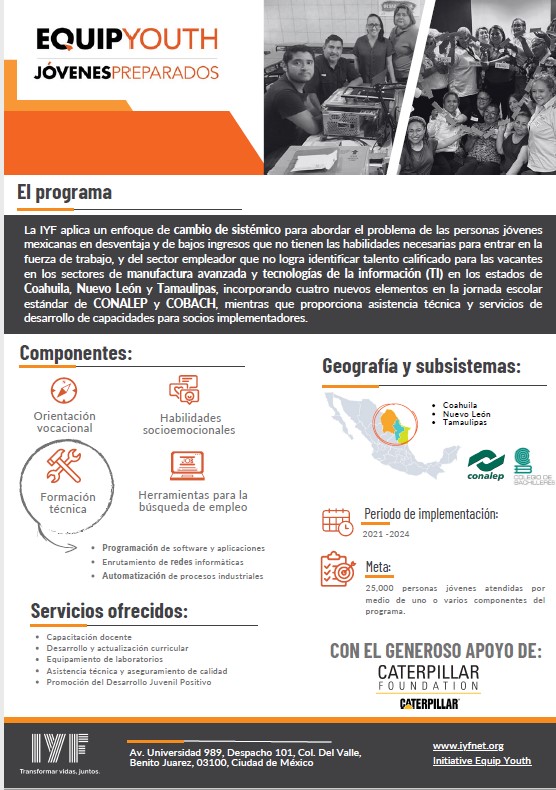 This document provides a brief description of the EquipYouth program in Mexico. IYF and the Caterpillar Foundation joined forces to create the initiative, which is providing market-relevant life and skills training along with job placement support and services to youth in 11 countries, including Mexico.