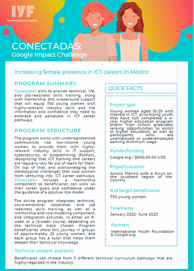 This fact sheet provides a brief description of the Conectadas program. This initiative was designed to provide technical, life, and job-readiness skills training, mentorship, and wraparound support to equip 750 young women with highly relevant industry skills and the information and confidence they need to embrace and persevere in ICT career pathways.