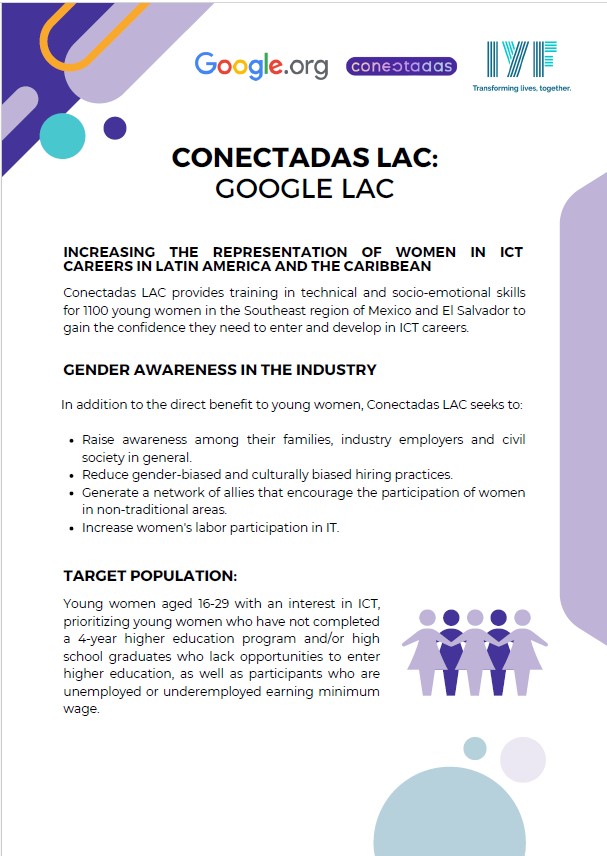 This fact sheet highlights IYF’s Conectadas LAC program, which aims to equip young women aged 16-29 with in-demand technical skills. The initiative focuses on preparing these youths for promising careers in the Information and Communication Technology (ICT) industry in Southeastern Mexico and El Salvador.