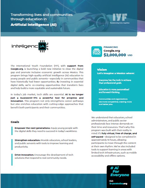 This fact sheet outlines IYF’s new initiative, supported by Google.org, to expand access to quality education in Artificial Intelligence (AI) across Mexico. The program focuses on equipping young people and public sector professionals—especially in communities that