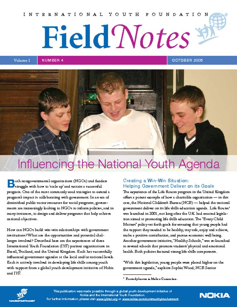 This issue of FieldNotes focuses on the ways in which organizations can influence their country's national agenda. It discusses the examples of three partner organizations in Brazil, Thailand, and the United Kingdom that have successfully influenced government agendas at the local and/or national levels. Each is actively involved in developing life skills among youth with support from a global youth development initiative of Nokia and IYF.