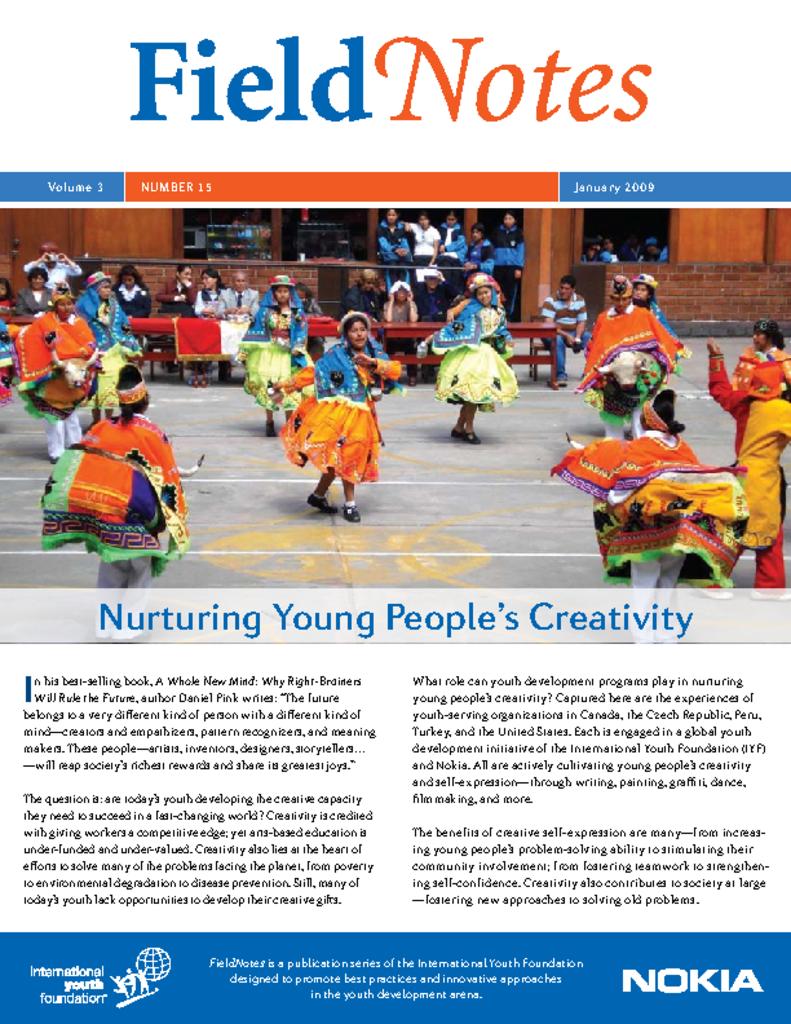 This issue of FieldNotes focuses on the role youth development programs can play in nurturing young people’s creativity. It discusses the experiences of youth-serving organizations in Canada, the Czech Republic, Peru, Turkey, and the United States that are engaged in a global youth development initiative of the International Youth Foundation and Nokia.