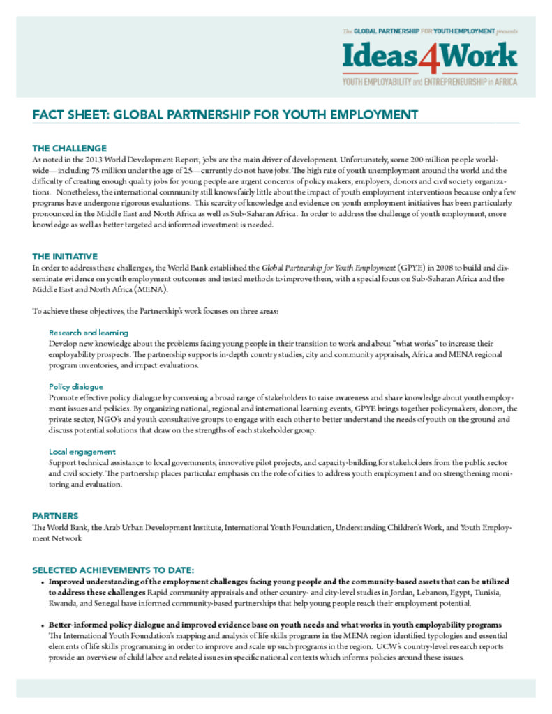 This fact sheet provides a brief description of the Global Partnership for Youth Employment (GPYE). This partnership builds and disseminates evidence on youth employment outcomes and tested methods to improve them, with a special focus on Sub-Saharan Africa and the Middle East and North Africa (MENA).