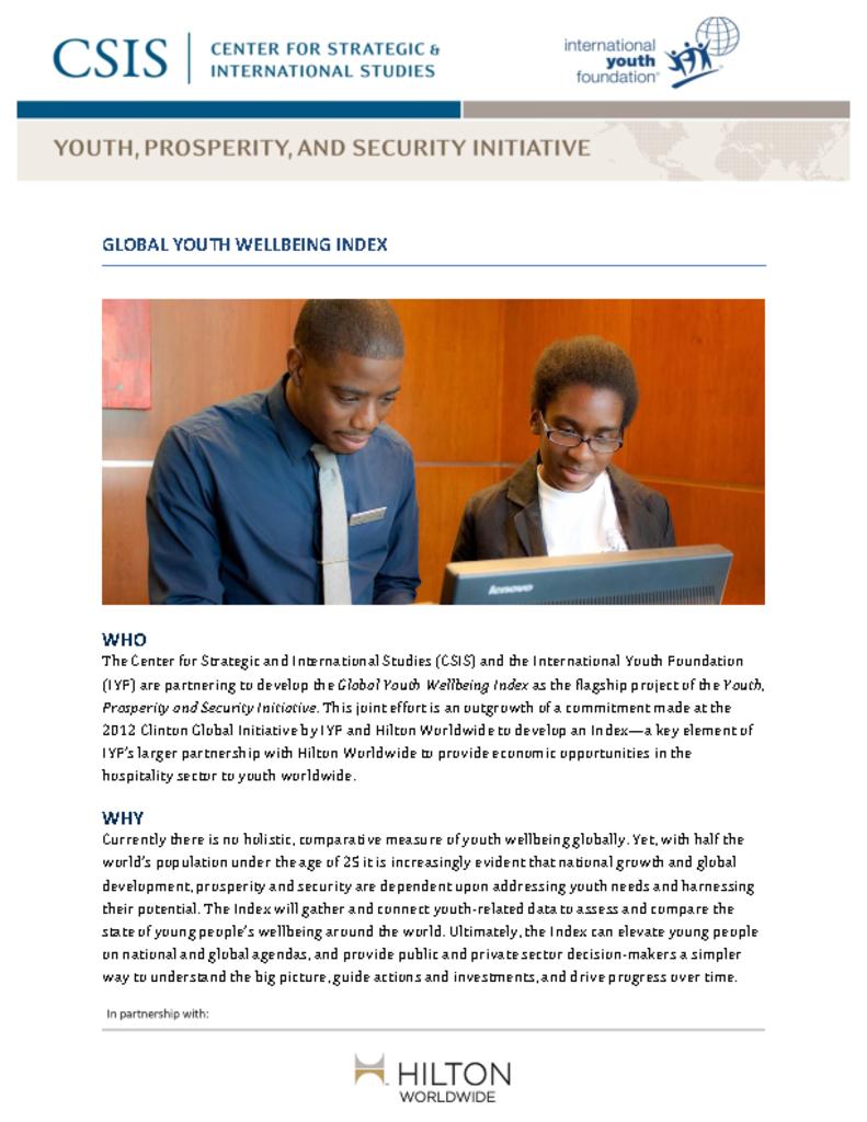 This fact sheet provides a brief description of the Global Youth Wellbeing Index. The index is a joint effort by the International Youth Foundation (IYF) and the Center for Strategic and International Studies (CSIS), with funding from Hilton Worldwide. It seeks to assess and compare how young people are doing around the world and, in doing so, advance the youth policy agenda concerning youth and guide strategic investments.