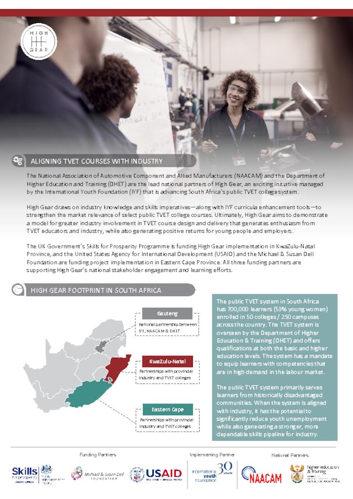 The National Association of Automotive Component and Allied Manufacturers (NAACAM) and the Department of Higher Education and Training (DHET) are the lead national partners of High Gear, an exciting initiative managed by the International Youth Foundation (IYF) that is advancing South Africa’s public Technical and Vocational Education and Training (TVET) college system. High Gear draws on industry knowledge and skills imperatives—along with IYF curricula enhancement tools—to strengthen the market relevance of select public TVET college courses. The program was launched in November, 2019 and runs through June, 2024.