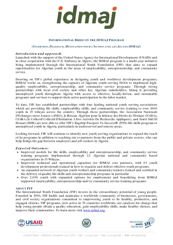 This fact sheet provides a brief description of the IDMAJ program in Algeria. The three-year program aims to expand opportunities among Algerian youth in the areas of employability, entrepreneurship, and civic engagement. The fact sheet is available in English, Arabic, and French.