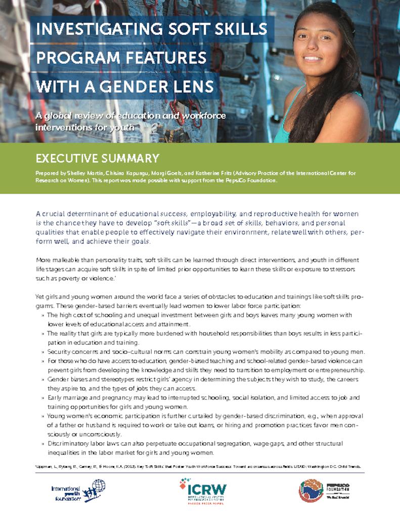 Investigating Soft Skills Program Features with a Gender Lens: A global review of education and workforce interventions for youth is the result of a collaboration between the International Center for Research on Women and the International Youth Foundation, and aims to map the constellation of features that characterize the most successful soft skill programs for girls and young women.