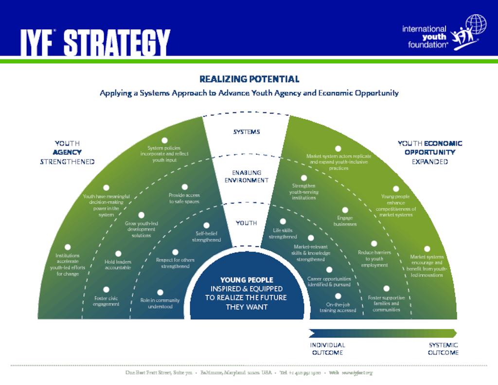 Three interconnected strategic objectives power IYF's mission: strengthening youth agency, expanding economic opportunity, and ensuring systems are more youth inclusive and responsive. This document provides a visual representation of those objectives—and our efforts to help young people gain market-relevant technical and life skills, and they foster enabling environments and enhance the systems within which we all live and work.