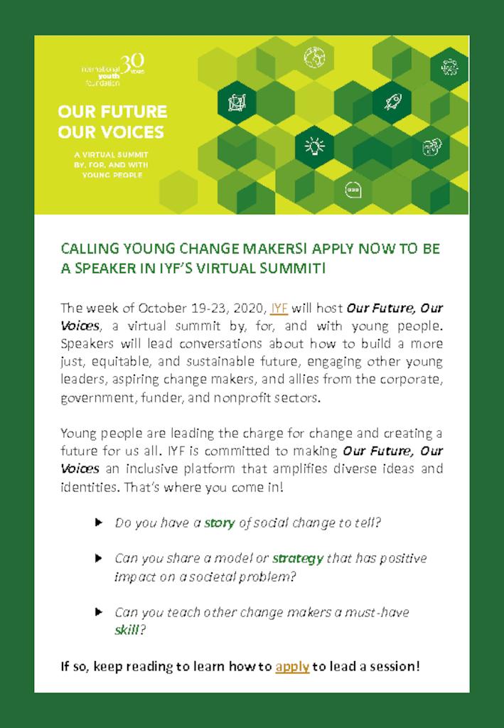 In October 2020 IYF will host Our Future, Our Voices—a virtual summit by, for, and with young people. Committed to creating an inclusive platform, we are issuing an open call for applications from young changemakers ages 10 to 35. If you or someone you know is interested in leading a session as a storyteller, skill-builder, or strategist, download this information packet. Inside you'll find out more about the format, FAQs, and a link to the application.