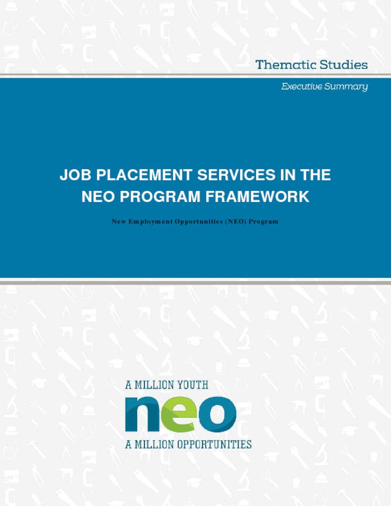 This document corresponds to the final report, “Job Placement Services in the NEO Program Framework”, which studied the NEO initiatives in Chile, Colombia, the Dominican Republic, Jamaica, and Peru. The study aimed to generate knowledge about the job placement strategies and services for opportunity youth that could help them enter the labor market. It is expected that the knowledge generated will be useful for both those in charge of providing public and private services and members of civil society who are involved in youth well-being services.