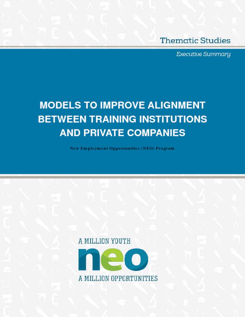 This document corresponds to the final report of the “Models to Improve Alignment between the Training Organizations and Private Companies” consultation for the initiatives in El Salvador, Mexico, Panama, Paraguay and Peru. The study was led by Aída Arango and Ana Miranda. Its overall objective was to analyze the models to improve alignment between the training organizations (supply) and private companies (demand) – henceforth referred to as S/D models – developed through partnerships created within the framework of the NEO initiative.