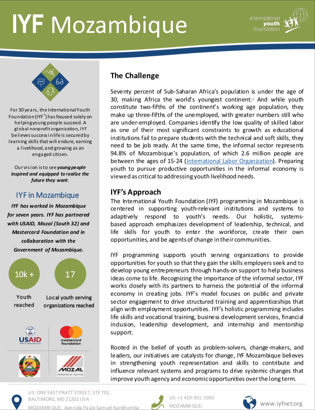 International Youth Foundation programming in Mozambique centers on supporting youth-relevant institutions and systems to adaptively respond to young people’s needs. Our holistic, systems-based approach emphasizes development of leadership, technical, and life skills to equip youth to enter the workforce, create their own opportunities, and be agents of change in their communities.