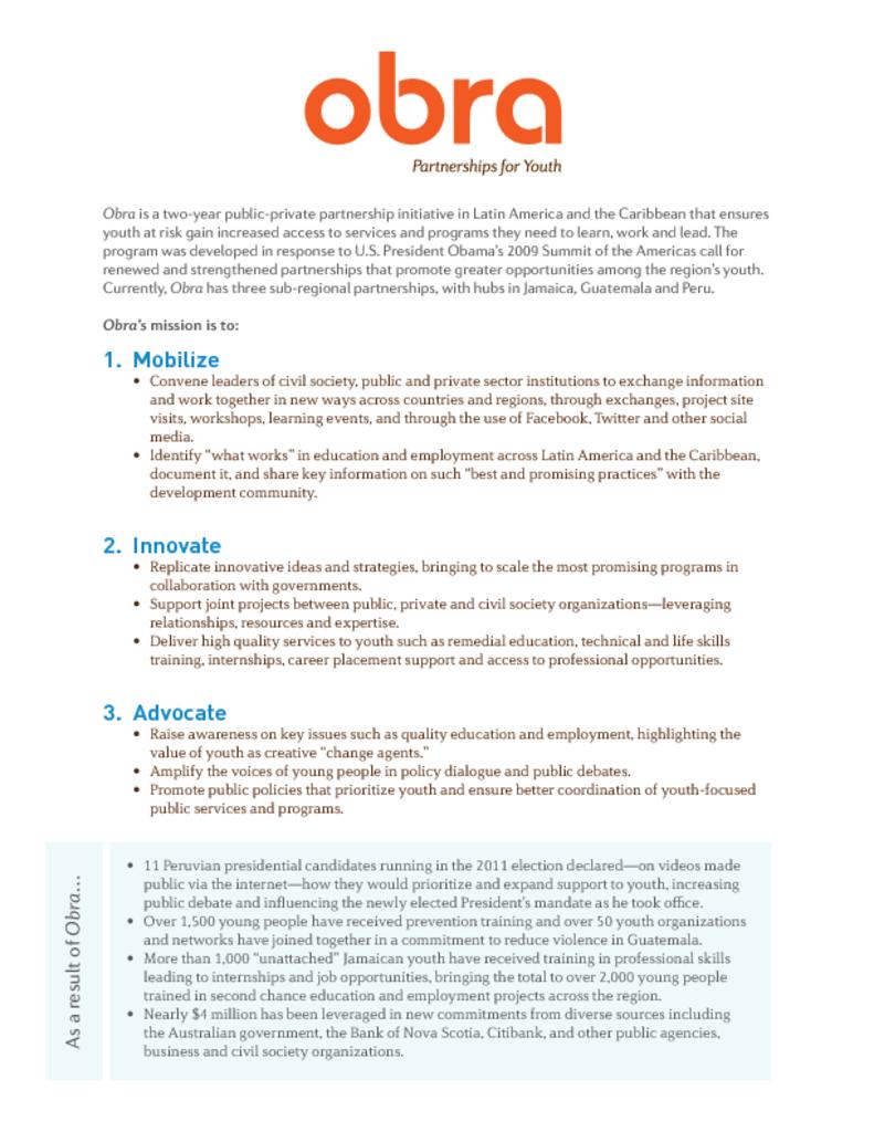This fact sheet provides a brief description of the Obra program. Obra is a two-year public-private partnership initiative in Latin America and the Caribbean that ensures youth at risk gain increased access to services and programs they need to learn, work, and lead.
