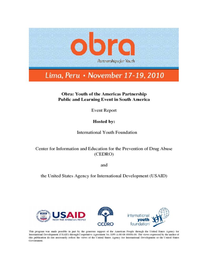 This event report presents the proceedings of the Obra program event and learning conference held in Lima, Peru, on November 17 to 19, 2010. The event was held in collaboration with the US Agency for International Development (USAID) and the Center for Information and Education for the Prevention of Drug Abuse.The report describes a summary of the days' proceedings. It details how to expand programming to serve at-risk youth and to continue to build and support alliances across the region.