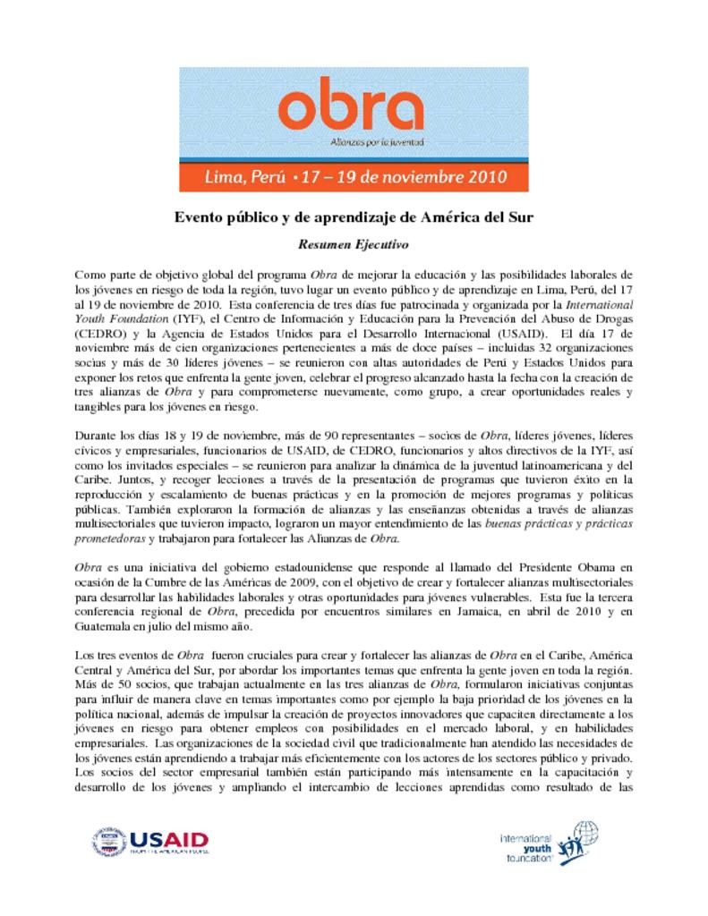 This event report presents the proceedings of the Obra program event and learning conference held in Lima, Peru, on November 17 to 19, 2011. It is available only in Spanish.