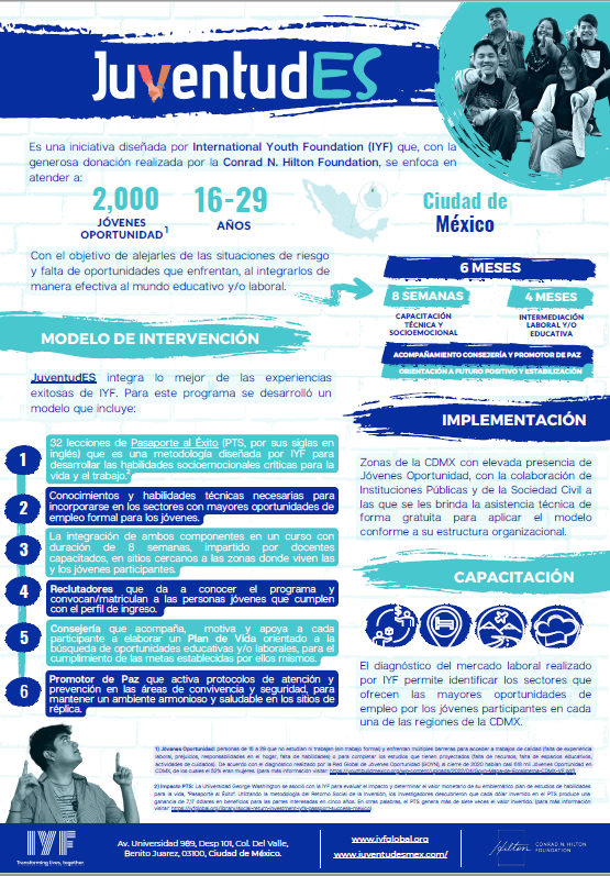This one-pager provides a brief description of the JuventudES program. This initiative was designed to take away Mexico City's youth from the situations of risk and lack of opportunities they face, by effectively integrating them into the world of education and/or employment.
