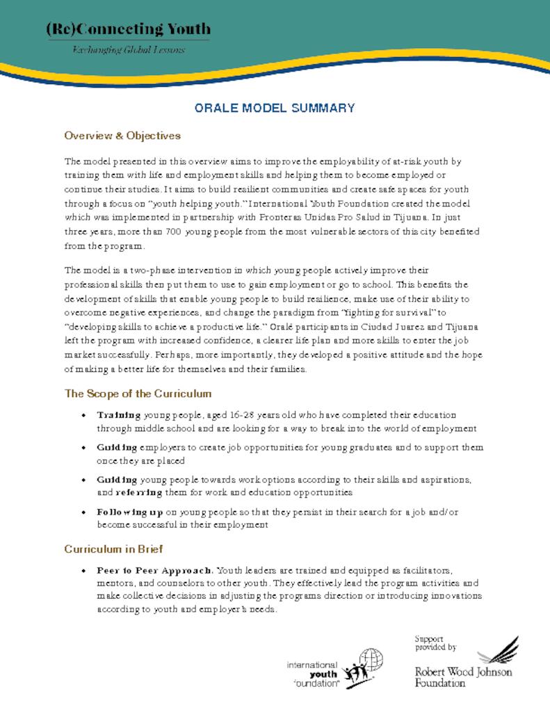 This summary document provides a brief overview of the Órale model. A two-phase intervention combining employability and life skills training with job placement services, Órale is helping orient hundreds of youth across Mexico to the world of work.