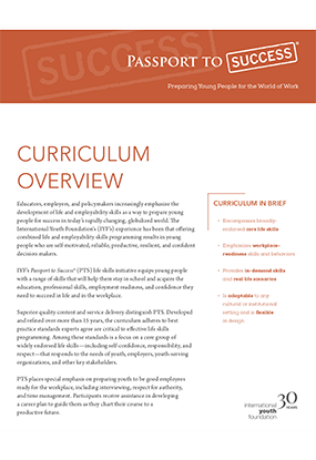 This overview of the Passport To Success® (PTS) curriculum provides information on pedagogy and methodology, key curriculum elements, results, a list of lessons, and a sample lesson. PTS is IYF's signature life skills training with an emphasis on preparing young people for the workplace and enhancing trainers' teaching styles.