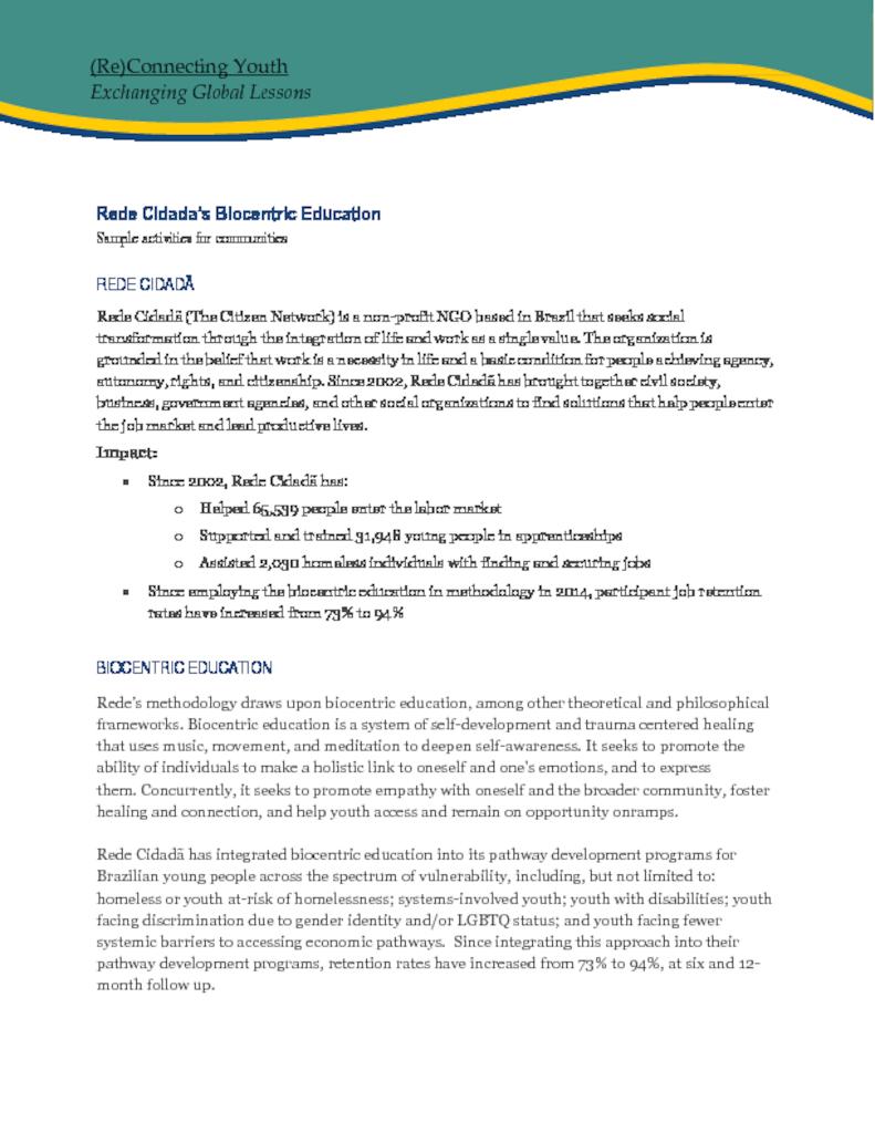Rede Cidadã (The Citizen Network), a (Re)Connecting Youth initiative partner organization, is a non-profit NGO based in Brazil that seeks social transformation through the integration of life and work as a single value. The following guide provides a sample of Rede Cidadã’s introductory biocentric education exercises that can be incorporated into workshops, classrooms and programs for youth in employability, education, and other pathway development programs. The activities are meant to help young people build awareness, connection, empathy for themselves and others.