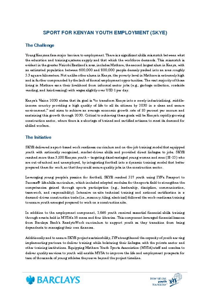 This fact sheet provides a brief description of the Sport for Kenyan Youth Employment project, which reached out-of-school Kenyan youth through training in life skills, financial literacy, and technical skills in a construction trade, as well as supporting job placement. The initiative leveraged youth passion for sport by integrating soccer into the rigorous employability model.