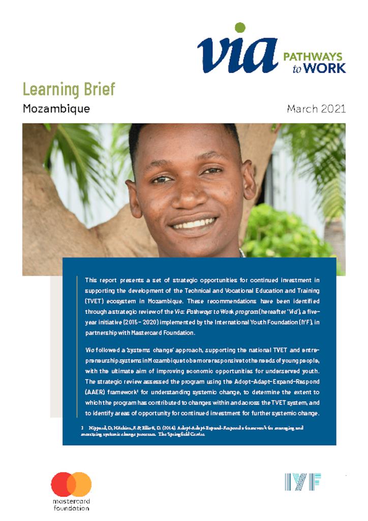 This report brief presents a set of strategic opportunities for continued investment in supporting the development of the Technical and Vocational Education and Training (TVET) ecosystems in Mozambique. These recommendations have been identified through a strategic review of the Via: Pathways to Work program, an initiative implemented by the International Youth Foundation (IYF), in partnership with Mastercard Foundation. Read a similar brief focused on Tanzania.