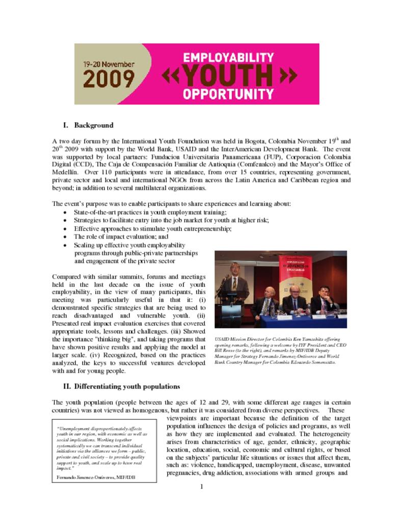This event report presents the proceedings of the Youth - Employability - Opportunity conference held in Bogotá, Colombia, on November 19 and 20, 2009. The event was held in collaboration with USAID and the World Bank's Global Partnership for Youth Employment initiative. The report is available in English and Spanish.