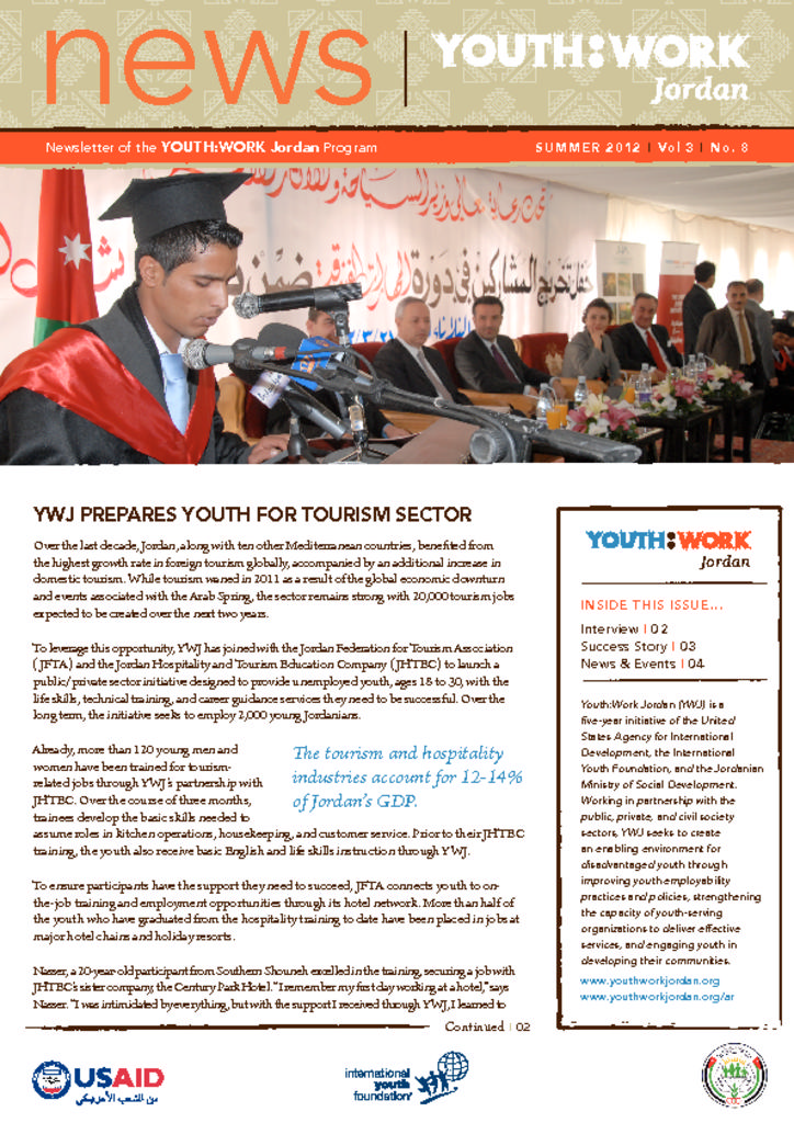 This Summer 2012 Youth for the Future Newsletter highlights the program's new hospitality and tourism initiative. It also includes an interview with His Excellency Senator Michael Nazzal, President of the Jordan Hospitality and Tourism Board and Vice President of the Jordan Hotels Association. The newsletter is available in English and Arabic.