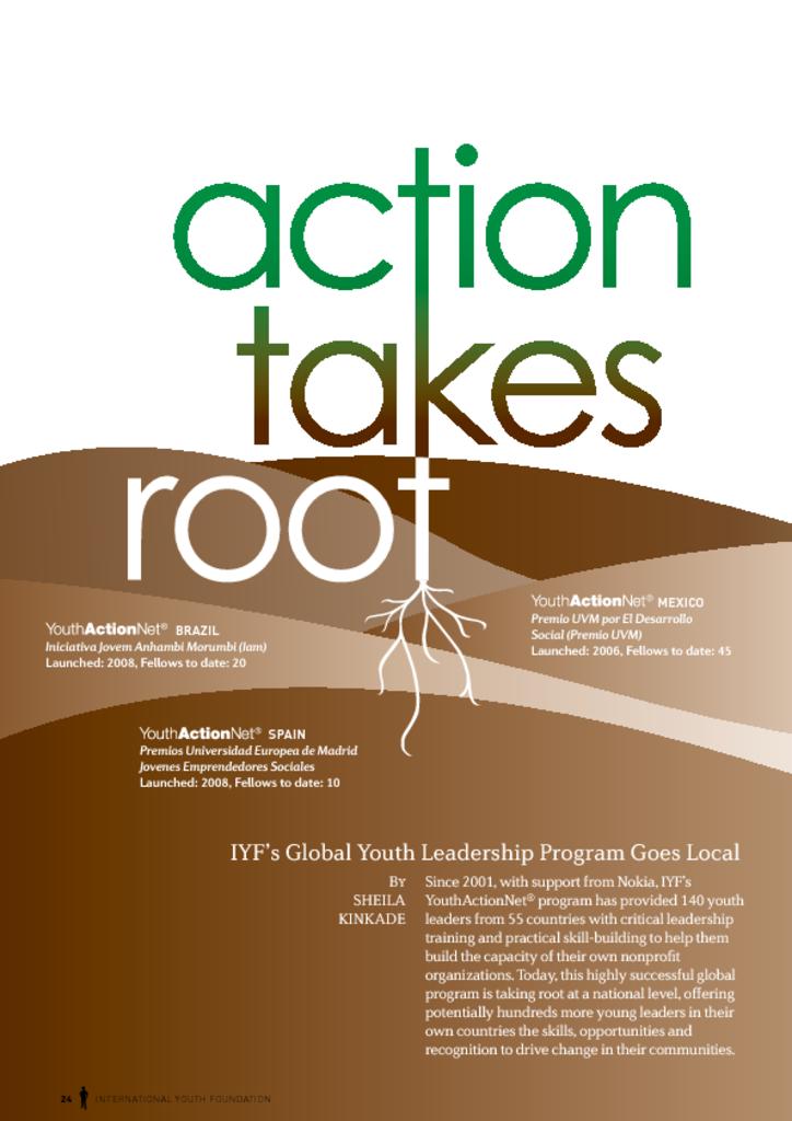 This article by Sheila Kinkade appeared in the Spring 2009 edition of YOUth magazine. Kinkade is the Manager of Marketing and Communications at the International Youth Foundation (IYF). In this article, she discusses how IYF's YouthActionNet® program is taking root at a national level, offering potentially hundreds of young leaders in their own countries the skills, opportunities, and recognition to drive change in their communities.