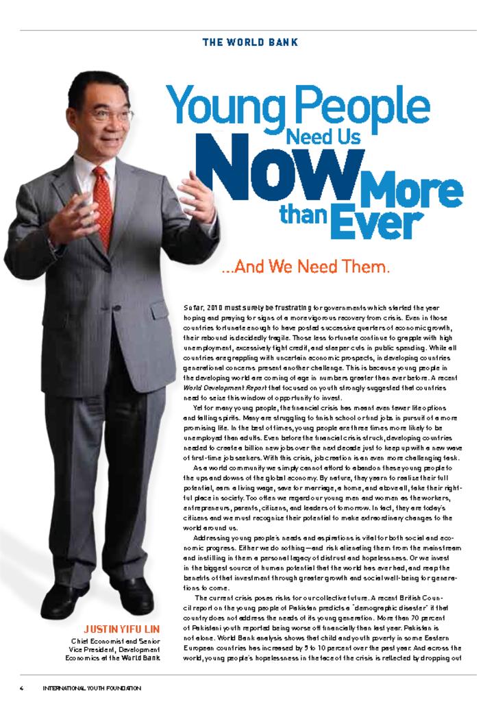 This article by Wendy Cunningham and Justin Yifu Lin appeared in the Summer 2010 edition of YOUth magazine. Cunningham is Coordinator of the World Bank's Children and Youth Program, and Lin is a Chief Economist and Senior Vice President at the World Bank. In this article, they press for greater investments in young people’s social and economic well being—even in difficult times—and warn of the severe consequences of inaction.